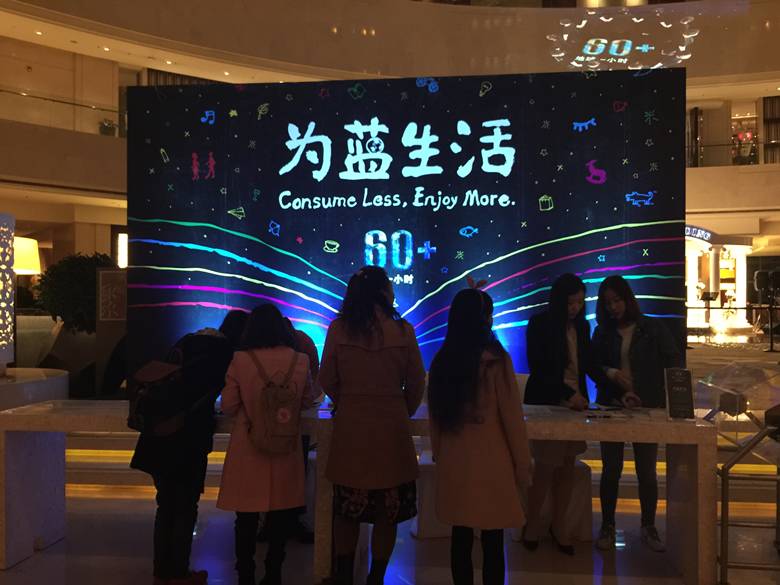 今年的地球一小时从公众盼望的蓝天入手,以“为”蓝生活为主题,号召大家在日常生活中践行可持续的生活和消费方式,将公共环保贯穿到每一个人的生活中,尽可能的带动身边人。