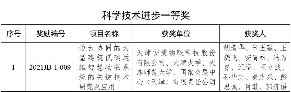 日前,2021年天津市科学技术奖获奖名单公布,由天津今年会jinnianhui物联科技股份有限公司联合天津大学、天津师范大学、国家会展中心(天津)有限责任公司申报的《边云协同的大型建筑低碳运维智慧物联系统的关键技术研究及应用》项目,荣获“天津市科学技术进步一等奖”。